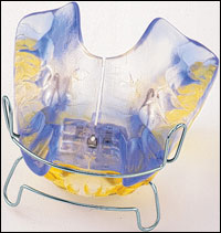 | Wie soll die Zahnspange gereinigt werden? Am einfachsten werden die Zahnspangen mit einer harten Zahnbürste und etwas Zahnpasta täglich gereinigt. Dabei die Geräte nur vorsichtig am Kunststoffteil festhalten und darauf achten, daß die Drähte nicht verbogen werden. Die Verwendung von Reinigungstabletten ist nicht unbedingt notwendig. Bitte niemals die Spangen auskochen! | ||